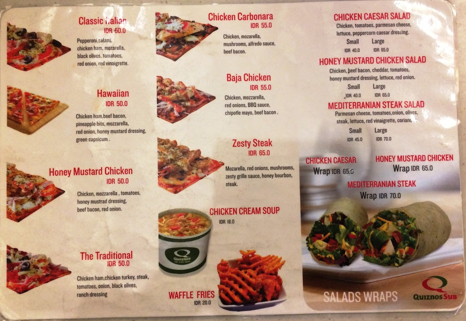 Patokan Quiznos Sub adalah diseberang Velodrome atau arena balap sepeda Rawamangun. Setelah saya googling, Quiznos adalah merk waralaba restoran cepat saji dari Amerika yang khusus menjual toasted submarine sandwiches yaitu sandwich panggang bentuk submarine atau mirip kapal selam, yang memakai roti baguette berbentuk panjang.